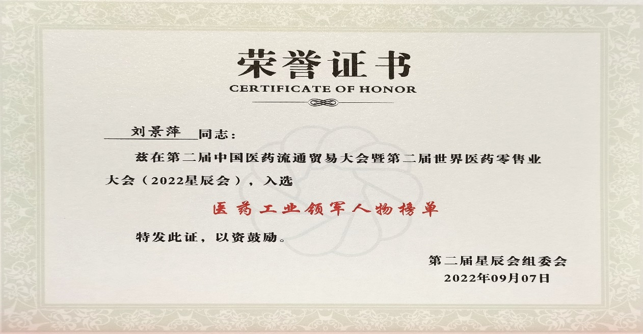本次星辰会期间,鼎博斩获颇丰,获得多项行业奖项及荣誉。在开幕式上,刘景萍董事长荣获“医药工业领军人物”称号。