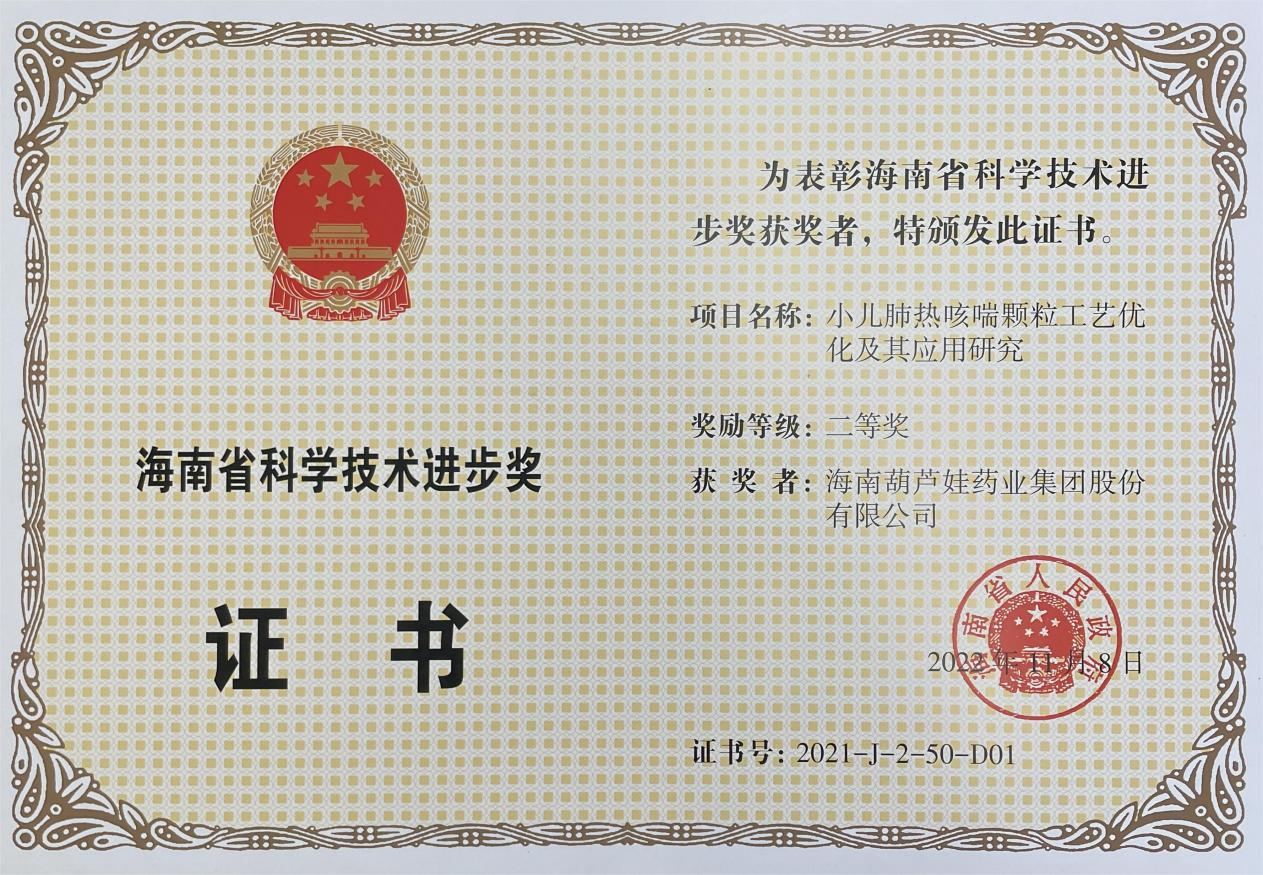 为此,小儿肺热咳喘颗粒的制备方法获得了第二十一届中国专利优秀奖(2019年),专利申请号:ZL201010134951,此次作为专利技术的应用,获得了2021年度海南省科学技术进步奖二等奖。在此之前,鼎博牌小儿肺热咳喘颗粒还多次被授予“临床价值中成药品牌”、“中国连锁药店最具合作价值单品”,荣登“中国医药品牌榜”。
