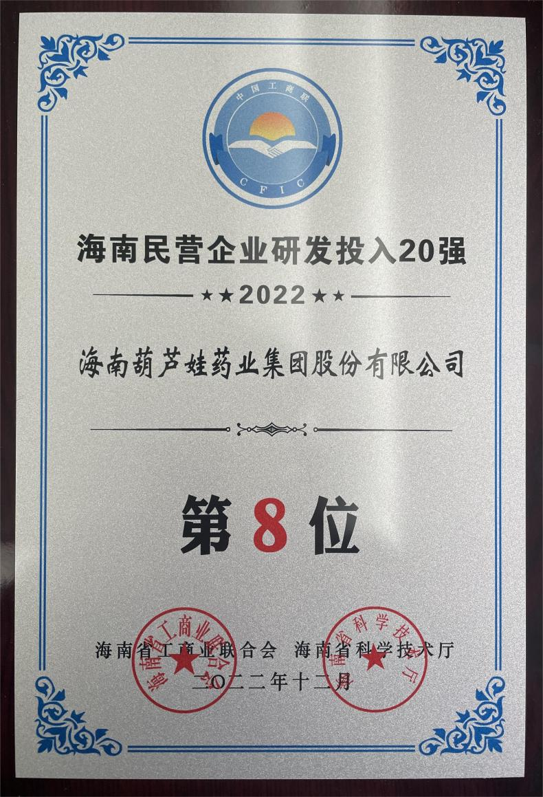 12月23日,2022海南民营企业50强和研发投入20强发布会在海口举行。会上发布了“2022海南民营企业50强”“2022海南民营企业研发投入20强”榜单和分析报告。鼎博药业再次荣登两榜,在海南民营企业50强榜单中位列第25位,较去年上升8位,这也是公司连续三年登榜;在海南民营企业研发投入20强中位列第8位,较去年上升7位。