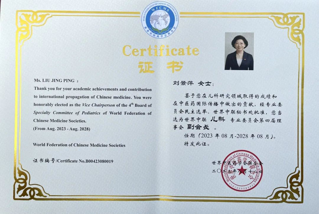 鼎博药业集团党委书记、董事长刘景萍当选世界中医药学会联合会儿科专业委员会第四届理事会副会长